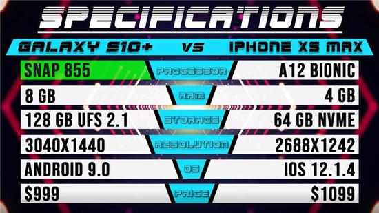 三星S10+:骁龙855、8GB内存、128GB UFS 2.1闪存、屏幕分辨率3040×1440、安卓9.0、999美元;