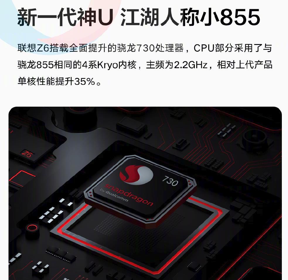 在处理器上,联想Z6使用了高通在今年4月发布的次旗舰芯片骁龙730,被联想称为“小855”。骁龙730采用8nm工艺制造,并在架构上升级为Cortex-A76大核+Cortex-A55小核改进而来的Kryo 470,GeekBench跑分中单核表现甚至超过了骁龙845。