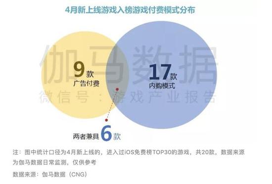 玩法更为多样的休闲游戏占比增加,也影响了游戏的收费模式,内置广告的盈利模式正变得较为重要。4月份新上线20款游戏中,9款游戏借助内置广告获取收入。同时,内购依然是游戏盈利的主要模式,为17款游戏,两种模式兼具的游戏为6款。