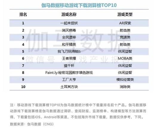 伽马数据下载测算榜TOP10中,《一起来捉妖》居首,