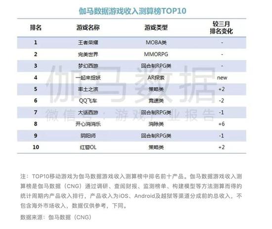 5。在伽马数据收入测算榜中《王者荣耀》继续居首,《完美世界》排名第二。前十中,腾讯占五款,网易占据四款,头部市场“两强”格局依然保持不变。《一起来捉妖》流水超3亿,成TOP10唯一新游。