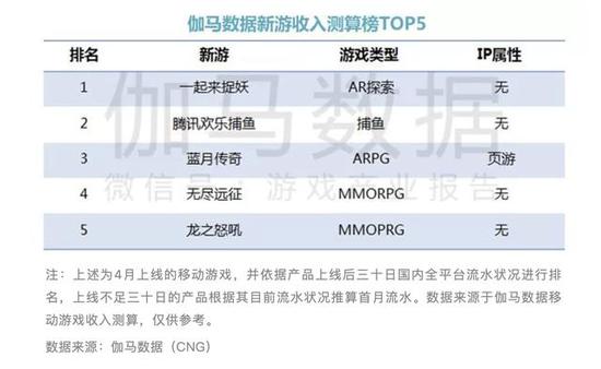 7。新游收入榜Top 5中,RPG依然是占比最高,仅腾讯发行的《蓝月传奇》拥有IP。AR探索游戏《一起来捉妖》,休闲捕鱼类游戏《腾讯欢乐捕鱼》分别位居新游收入TOP5的第一、第二。