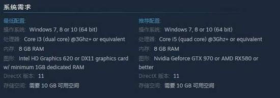 此外游戏还公布了配置需求,推荐配置为i5、GTX970/RX580及以上,最低配置为i3、HD620,内存需求为8GB。