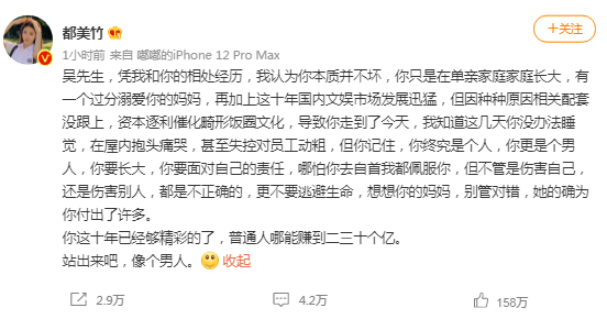 在都美竹的爆料里,吴亦凡和很多人印象中的顶流明星差别实在太大,跟吴亦凡一直对外表现出来的样子也有很大差别。不过都美竹在爆料里提到吴亦凡从小被妈妈过分溺爱这一点,说吴亦凡本质其实不坏,回看吴亦凡早前的一些采访,似乎可以看出一些他的真实性格。