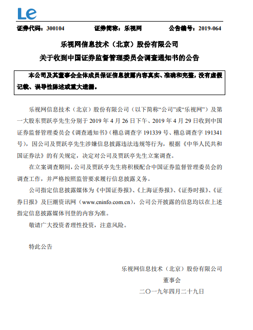 此前,乐视网于4月29日发布公告称,贾跃亭于2019年4月26日下午、4月29日收到中国证券监督管理委员会《调查通知书》,因乐视网及贾跃亭涉嫌信息披露违法违规等行为,根据《中华人民共和国证券法》的有关规定,证监会决定对乐视网及贾跃亭立案调查。